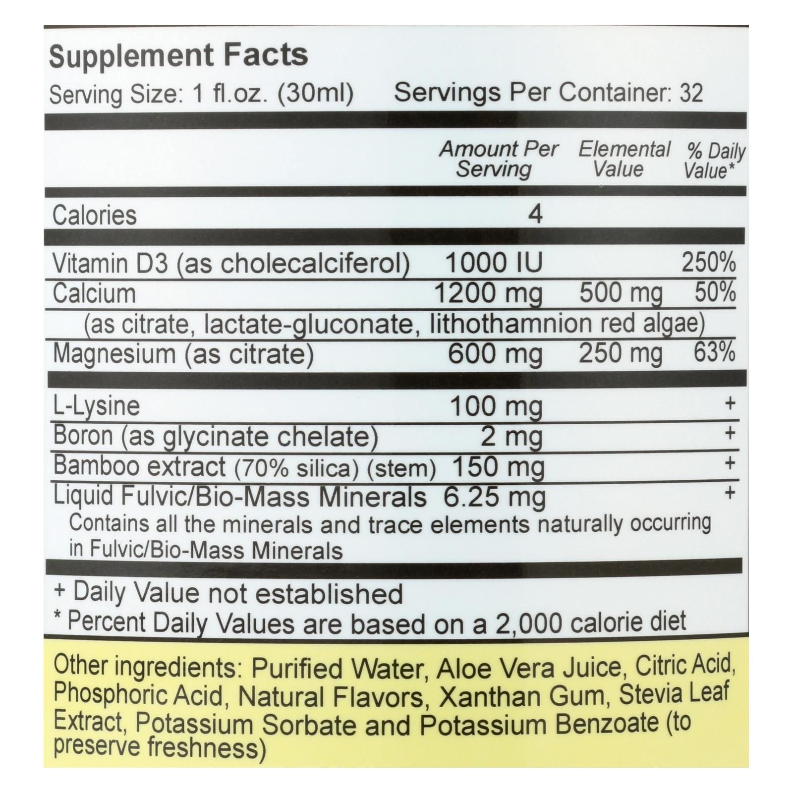 Vital earth liquid calcium-magnesium supplement contains a high potency combination of vitamin d3, calcium, magnesium, l-lysine, boron, bamboo stem extract and plant-based fulvic minerals. Every 32 fl. Oz. Bottle of vital earth calcium-magnesium is free of gluten, gmos, artificial colors and flavors, starch, yeast, sodium and sugar. It is also 100% vegetarian. Please read all product usage and warning labels, including allergen information, before using.